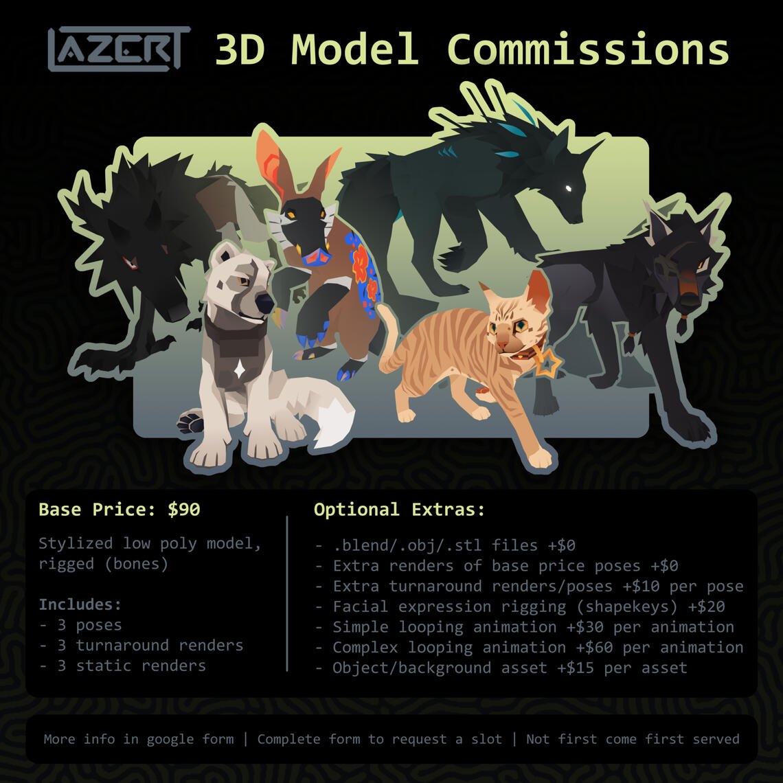 Thanks for taking an interest in my commissions!To check availability, please click on the form link to see if the form is currently accepting responses.Commissions are not first come first served and a slot cannot be guaranteed. Please do not contact me first if you have submitted a form, I will contact you if you received a commission slot.I am not currently open for 2D commissions (except for paid ko-fi requests here).